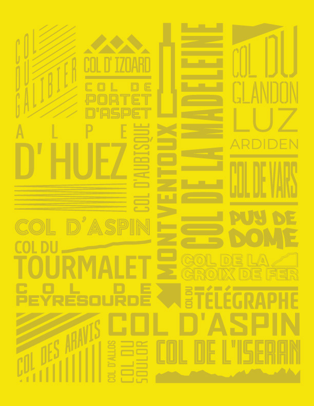 Custom jersey design to commemorate the Tour de France. The design uses graphic treatments of the names of the most iconic climbs in the race's long history. Winner's Yellow Jersey is the inspiration for the color pallet.